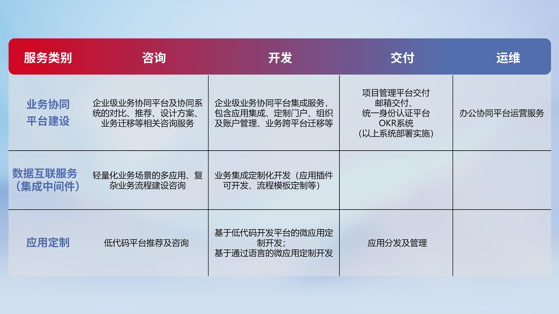 针对钉钉、、、企微、、、IDaas等平台级产品提供产品的规划、、方案、、交付、、、、定制化开发等服务,,实现如统一协同办公、、智能客户服务、、、混合会议管理、、、智能数据查询、、、等业务场景,,,,实现数字化转型。。。。